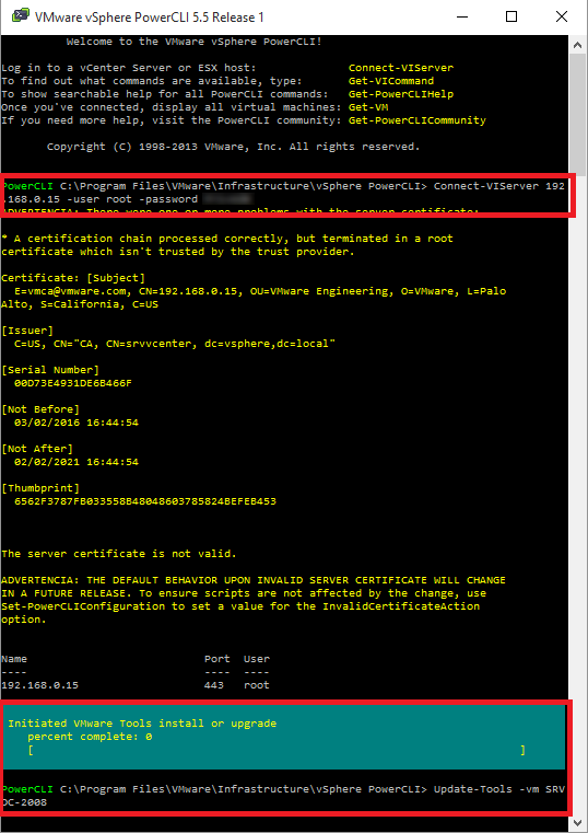 En nuestro laboratorio instalaremos las VMWare tools a una máquina virtual llamada SRVDC-2008, por tanto escribiremos el siguiente comando.
